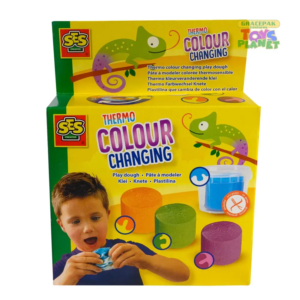 SES Thermo Color Changing Play Dough can change color. When you knead the play dough, the warmth of your hands will change the color of the play dough from blue to white, purple to pink, orange to yellow, and green to light green! Make the most beautiful creations and watch how these slowly change color as they cool down. The play dough is bright, soft and can be used again and again because of the resealable packaging. The play dough changes color as the temperature changes Mix and play Very soft Doesn’t dry out while playing