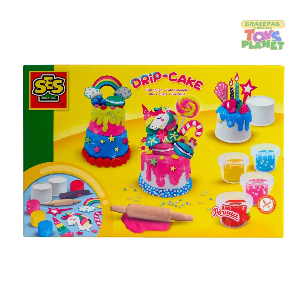 Our SES Play Dough, Drip Cakes makes amazing drip cakes. Choose one of the four colors of gluten-free glitter dough and use tools and the ice cream cups to make them. Press the cardboard parts supplied into the dough and sprinkle foam sprinkles on top as finishing touch! Develops creativity and imagination Develops concentration and motor skills in children Glitter and aroma play dough Items included: 4 Dough Tubs, 2 Cups, 8 Cake decorations, 1 Decoration Comb and 1 Rolling Pin
