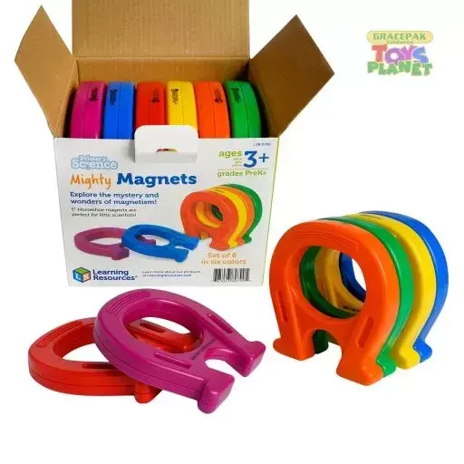 Students are drawn to these colorful horseshoes shaped-magnets! Perfectly sized for smaller hands, the 5″ magnets are magnetically correct: 1 foot north and 1 foot south. Made of durable plastic in 6 colors: red, orange, yellow, green, blue and violet.