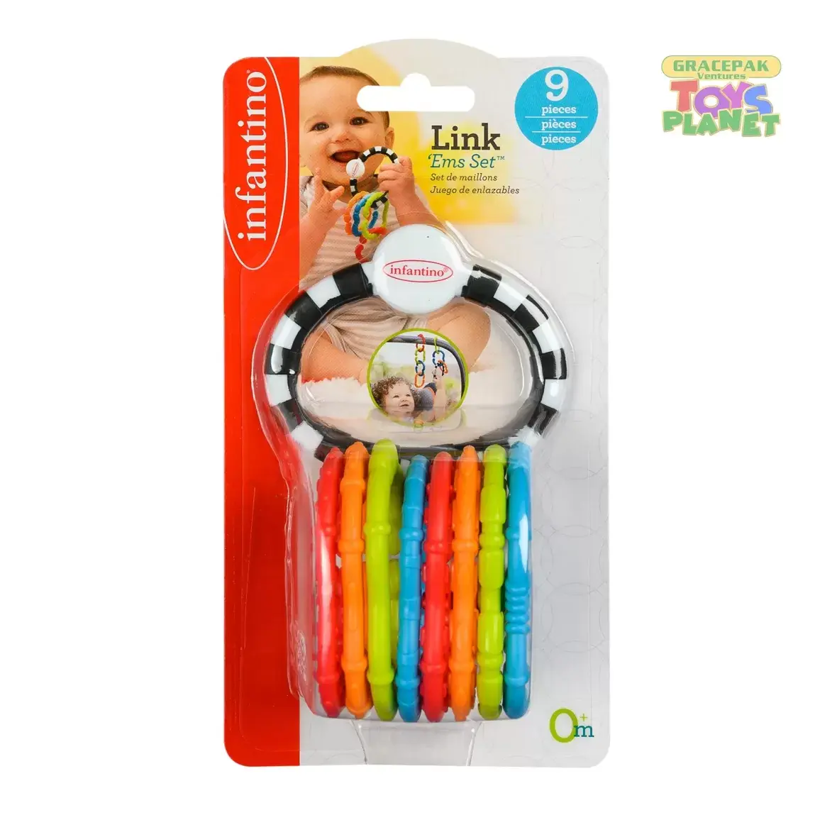 Our Link EMS Set is made of different textures and shapes for sensory development. It features vibrant colors and baby-specific cute designs. Designed for creative play and ideal for older infants. A perfectly sized rattle for little hands to hold. Satisfies baby’s mouthing and teething needs.